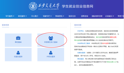 访问学校就业创业指导中心主页http://job.xjtu.edu.cn/,点击页面右上角“登陆”进入登陆界面。