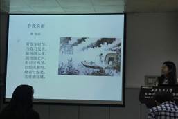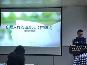 春花随风初谢,夏初嫩绿伴点点樱红,赏析会首先由王祥桂带领大家品味一首《题都城南庄》作为开篇,接下来由段小曼带领大家赏析杜甫的《春夜喜雨》,带领大家体会诗中春夜降雨,润泽万物的美景。随后由刘邺辉带领大家品味了一首舒婷的现代诗,其后由于建军通过几首诗带领大家领略西湖风光和陕西风光,活动最后由杨培伟和王卓馨给大家带来清新自然的《你是人间的四月天》和活力动人的《减字木兰花•莺初解语》,使大家切实领略到春天的可贵和世间的灵动与美好。