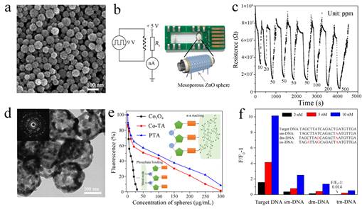 植物多酚是一种价格低廉、无毒、已实现工业化生产的天然提取物,广泛用于皮革、墨水等领域。基于植物多酚配位化学的基本原理,生命学院赵永席教授团队魏晶教授等人以不同的金属-多酚配合物为前驱物,通过控制配合物的热分解过程,得到了一系列不同组成及内部结构的介孔金属氧化物纳米颗粒(如氧化铝、氧化锌、氧化钴、氧化铁、氧化铜)。研究发现,金属会影响有机物(即植物多酚)的热分解过程,比如铝会增强有机骨架的稳定性,铁、铜、钴元素会加速有机骨架的分解。有机物的分解温度和金属氧化物的结晶温度共同影响介孔金属氧化物的内部结构(如实心或空心结构)。由于介孔金属氧化物具有规则的形貌、高比表面积及高结晶度,这种材料进一步用于构筑气体传感器,可实现酒精气体的高灵敏、高选择性检测。同时这种介孔金属氧化物材料与核酸(DNA, RNA)的磷酸基团有着强的配位作用,可有效吸附DNA探针分子。可进一步构筑介孔金属氧化物基纳米探针,实现核酸的高灵敏、高特异性检测。由于植物多酚可以和不同种类的金属离子形成配位物,这种简单的热分解方法有望用于低成本、大规模制备多种组分介孔金属氧化物,并广泛用于环境催化、清洁能源的存储与转化、气体传感及生物传感等领域。
