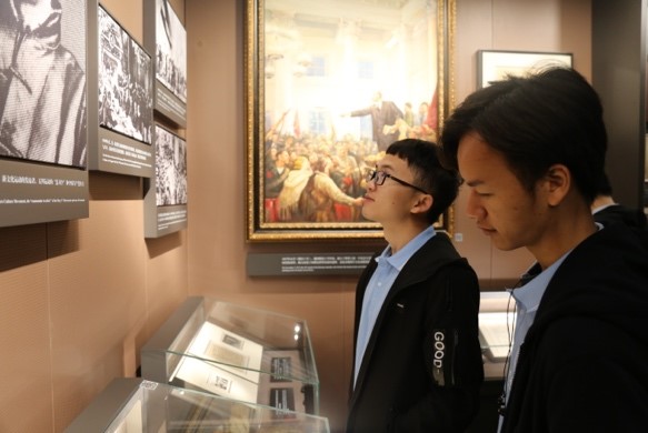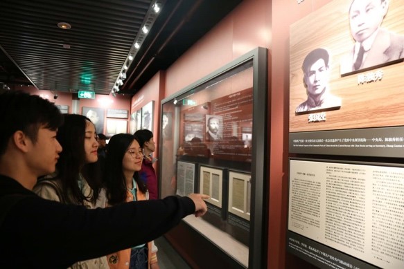 中共一大会址纪念馆是位于上海市兴业路76号的一座充满故事的建筑,1952年建成开放后便庄重肃穆的立于繁华之都。青墙红砖遮住了风雨岁月,拱形门楼却关不住悠悠历史。一入门,首先映入眼帘的是参加一大会议的十三位代表巨型铜雕,英雄辈出,大浪淘沙,令人感叹。这里主要包含了中国共产党成立的历史背景、中国共产党早期组织的成立及其活动、中国共产党第一次全国代表大会召开的全过程三个组成部分。进入二层展厅,一件件饱经沧桑的珍贵史料、一张张定格历史的资料照片、一个个再现原貌的模拟场景,都让师生放慢脚步,用心去体会、去品味展品中铭刻的光荣与辉煌。党旗鲜红,照片肃穆,纸质泛黄,一大会址纪念馆展开的80余年历史画卷,斗争年代的艰苦卓绝仿若历历在目,却更加坚定了师生对党的忠诚信念,激发了艰苦奋斗的激情。