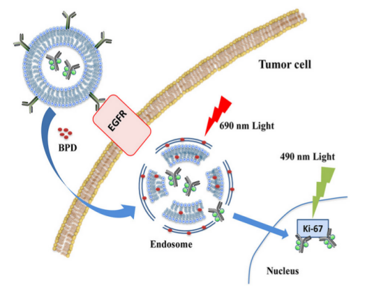 利用纳米和光学技术对细胞内药物进行空间和时间上进行操控是目前肿瘤精准医疗的一大研究前沿和热点。该论文中展现了一种针对肿瘤细胞膜上EGFR因子和细胞核仁内Ki-67蛋白的高选择性双重靶向光控灭活技术。利用表面修饰EGFR抗体Erbitux的免疫脂质体将内含FITC标记的 Ki-67蛋白抗体TuBB-9光敏免疫药物靶向输送到高EGFR表达水平的肿瘤细胞中。通过光敏剂BPD介导的光化学内化(Photochemical Internalization,PCI)方法,利用690nm激光实现了光敏免疫药物TuBB-9-FITC的光控细胞内药物释放和药物对细胞核内Ki-67蛋白的靶向,辅以第二次490nm光照激活光敏免疫药物,实现对细胞核内控制细胞增殖关键蛋白Ki-67的灭活,并促使肿瘤细胞的凋亡。此方法和药物在不同表面EGFR表达水平的肿瘤和正常细胞系中进行了检测,证明了其良好的选择性。