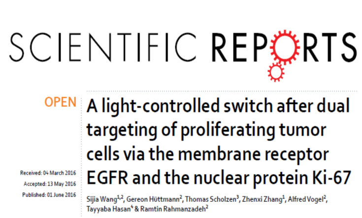 近日,生物医学光子学张镇西课题组博士研究生王斯佳一篇题为“A light-controlled switch after dual targeting of proliferating tumor cells via the membrane receptor EGFR and the nuclear protein Ki-67”论文在线发表在自然出版集团(Nature Publishing Group)旗下杂志Scientific Reports (2015年影响因子5.57)上,西安交通大学生命学院为该论文的第一完成单位。论文链接地址:www.nature.com/articles/srep27032。