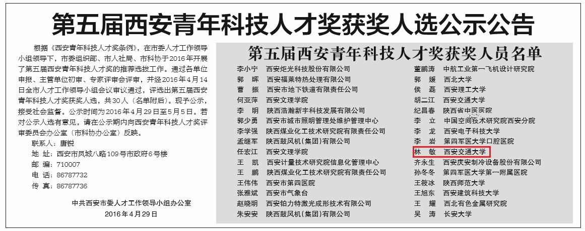 近日,中共西安市市委组织部、西安市人力资源和社会保障局、西安市科学技术协会公布了第五届西安青年科技人才奖获奖名单,生命学院青年教师林敏博士获得了此项荣誉。