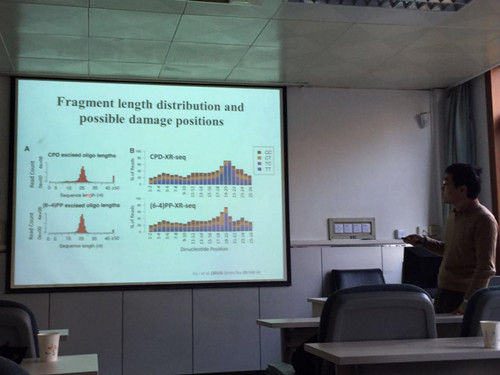 胡博士的报告内容主要围绕核苷酸切除修复(Nucleotide Excision Repair, NER)机制研究。NER可以修复环境致癌因子如紫外线, 以及化疗药物如顺铂等导致的DNA损伤,与癌症发生和化疗效果密切相关。胡博士率先从细胞内分离了修复过程中切下的含有损伤的DNA片段,通过对其进行高通量测序,第一次做到了在基因组水平上检测NER,并分析了转录对NER的影响,相关结果发表在JBC和Gene Dev上。利用该方法,胡博士等人发现基因组不同区域修复的先后顺序受染色体结构的影响,且与部分癌症的基因组不同区域的突变频率相关。DNA损伤的形成也会受到染色体结构等因素影响,而目前还没有一种灵敏准确的测序方法。胡博士等人建立了一种能以单碱基分辨率检测全基因组范围UV,顺铂等产生的损伤的方法,这种方法使我们第一次可以从基因组水平研究相关DNA损伤与修复,为进一步研究转录,染色体结构及其它因素对DNA损伤,修复和其引起的突变,以及对癌症的发生与化疗效果等的影响铺平了道路。