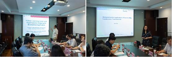 随后,王晶博士以“用于生物医学应用的高光谱成像深度学习模型” (A Deep Learning model with Hyperspectral Imaging for Biomedical Application)为题,向三位教授介绍了我们与韩方前期合作得到的一些实验结果并阐述了课题组对于该合作研究项目的研究计划。胡敏教授也作了题为“上转换发光纳米材料在生物学/医学上的应用”(Biological/medical applications of Upconverting Luminescence Nanomaterials)的报告,介绍该课题组在上转换发光纳米材料上的研究与生物医学上的应用。