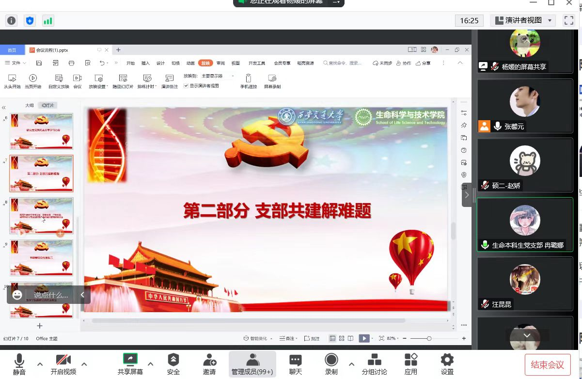 为深入学习领会党的二十大精神,10月27日晚,生命学院组织全体学生通过思源平台收看了马克思主义学院举办的《中国共产党第二十次全国代表大会报告解读》讲座。10月28日晚,生命学院各本科生党支部、团支部联合2022级两个硕士党支部共同举办党的二十大报告线上学习研讨会生命学院分党委副书记李剑君励志书院、南洋书院、仲英书院党建辅导员,生命学院(生物医学工程专业)南洋仲英励志师生联合党支部、生命学院(生物技术专业)励志书院师生联合党支部全体师生党员2022级硕士生第一党支部、第二党支部全体党员,以及本科生团员代表共220人线上参加学习生命学院党委组织员杨媛主持会议。