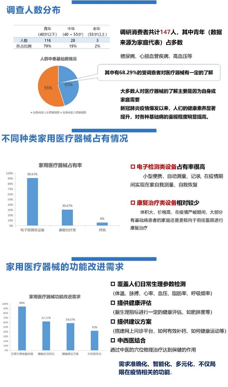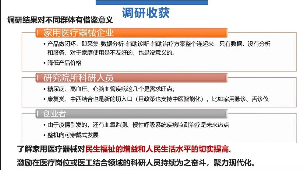 本次调研对不同群体都有借鉴意义:家用医疗器械企业如何降低医疗器械的价格、提高家用医疗器械的便携性是提高企业效益的两大重点;科研人员可关注康复类、中西结合类医疗器械领域前沿问题;后疫情时代,创业者可关注血氧监测,慢呼吸系统病监测治疗等热点。