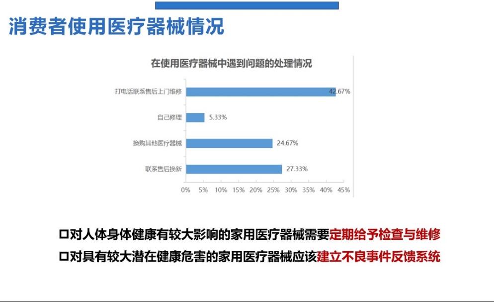 据调查,家用医疗器械的使用价值、功效是最受消费者关注的一点。由于网购的便捷以及群众对医疗器械专卖店信任程度较高,消费者购买时选择医疗器械专卖店和网购的人居多。消费者在使用家用医疗器械过程中遇到疗效不明显,指标监测不准确及操作复杂等问题,因此,家用医疗器械需要定期给予检查与维修。