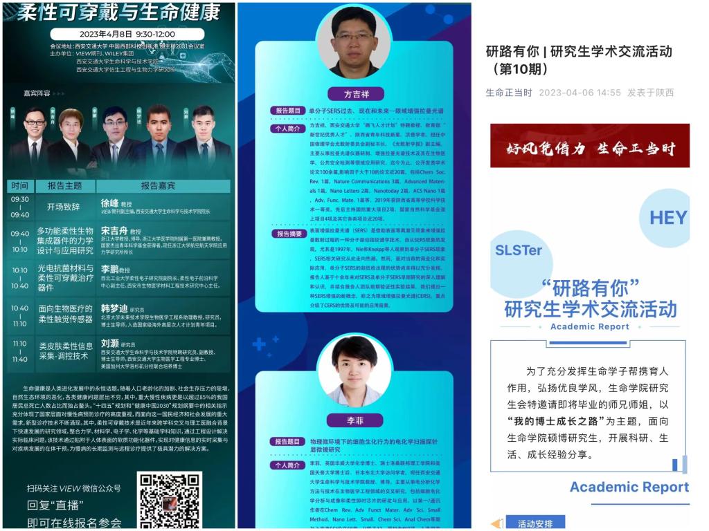 4月8日,学院与VIEW期刊联合主办“柔性可穿戴与生命健康”学术论坛,与北京大学、浙江大学、西北工业大学教授学者共话生命健康前沿问题。学院还持续开展“生物医学·元健康”学术报告、“研路有你”研究生学术交流等学术活动,通过搭建院内外学术交流平台,引导师生在交流互动中迸发创新火花,为学校“双一流”建设和学科发展贡献生命力量。