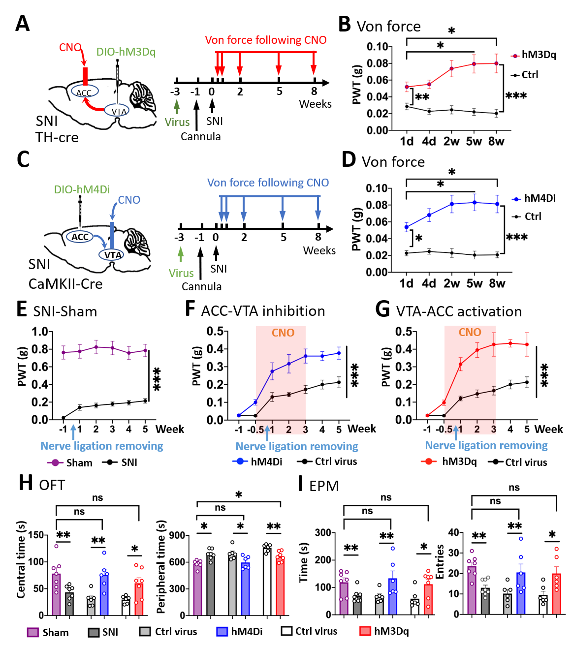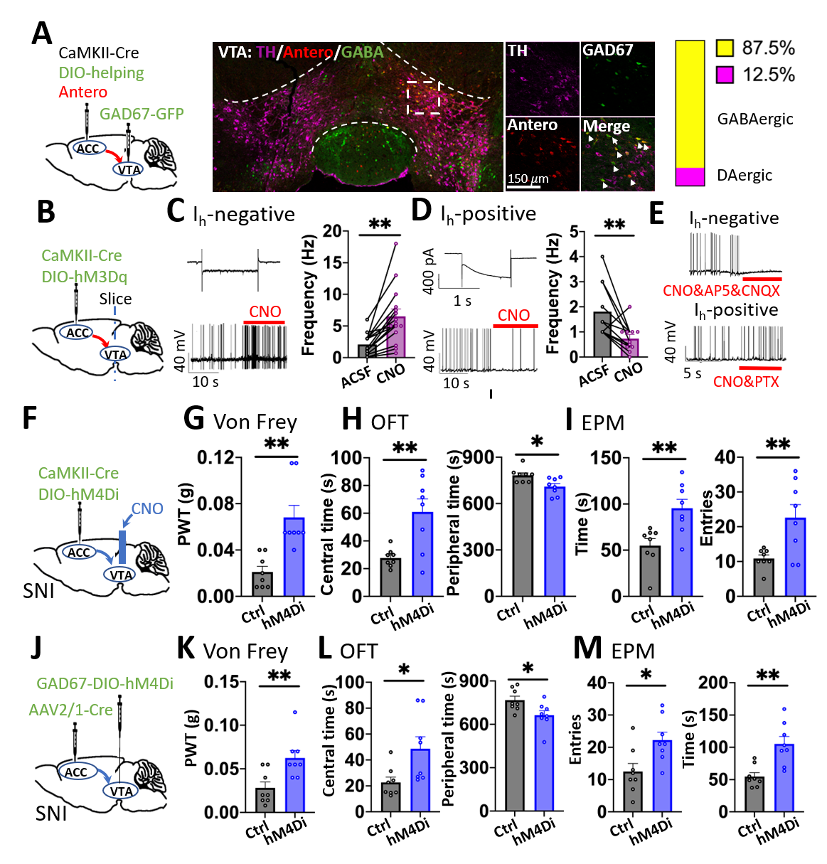 坐骨神经分支损伤(SNI)是一种经典的慢性痛模型,SNI小鼠除痛觉异常外,还会表现出多种负性情绪(焦虑、抑郁、厌恶)反应。团队通过电生理和电化学记录发现,SNI鼠VTADA神经元兴奋性降低、多巴胺分泌减少,化学激活VTADA神经元则能有效缓解慢性痛及其负性情绪改变。病毒示踪结果表明,痛觉信息处理中心ACCGlu神经元可直接投射到VTA区,结合化学遗传学偶联的电生理记录,团队发现ACCGlu神经元通过兴奋VTAGABA神经元间接抑制VTADA神经元,进而介导慢性痛伴发的负性情绪改变(图2A-E)。相反,通过化学抑制ACCGlu神经元向VTA的投射则能有效缓解慢性痛的痛敏异常及其诱发的负性情绪(图2F-M)。这些结果表明,ACCGlu神经元对VTADA神经元的抑制性调控是介导慢性痛相关负性情绪改变的重要机制。